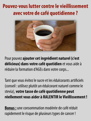 tasse de café quotidienne en élixir anti-vieillissement qui diminue naturellement votre glycémie et COMBAT le diabète. En utilisant les aliments exacts que je vous indique, vous pouvez changer votre habitude quotidienne de café pour en faire l'une de vos habitudes les plus saines !