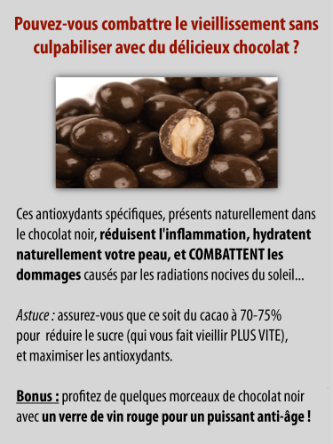scientifiquement prouvée du vin rouge pour ralentir le vieillissement. Le secret n'est pas simplement dans le fait d'avoir moins de stress... mais un très PUISSANT antioxydant qui détruit les radicaux libres dans votre corps. Buvez et profitez de ce super brevage anti-vieillissement !